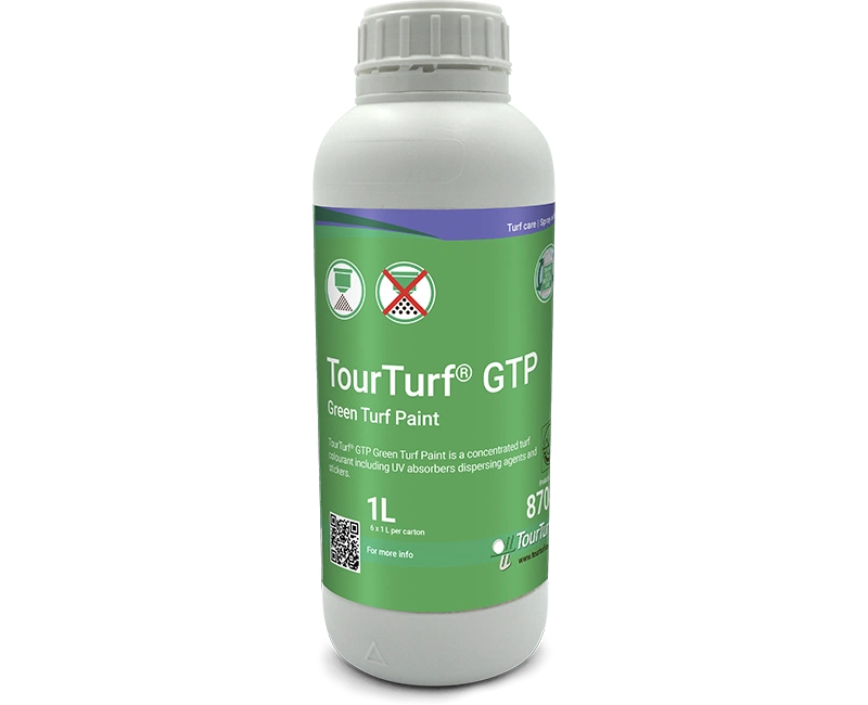 TourTurf® GTP (Green Turf Paint) je visokokakovosten barvni pigment, razvit posebej za uporabo na travnih površinah. Njegova funkcija ni le estetska – deluje tudi kot zaščitni sloj proti UV sevanju in toplotnemu stresu, kar omogoča bolj stabilno in zdravo travo v zahtevnih pogojih.